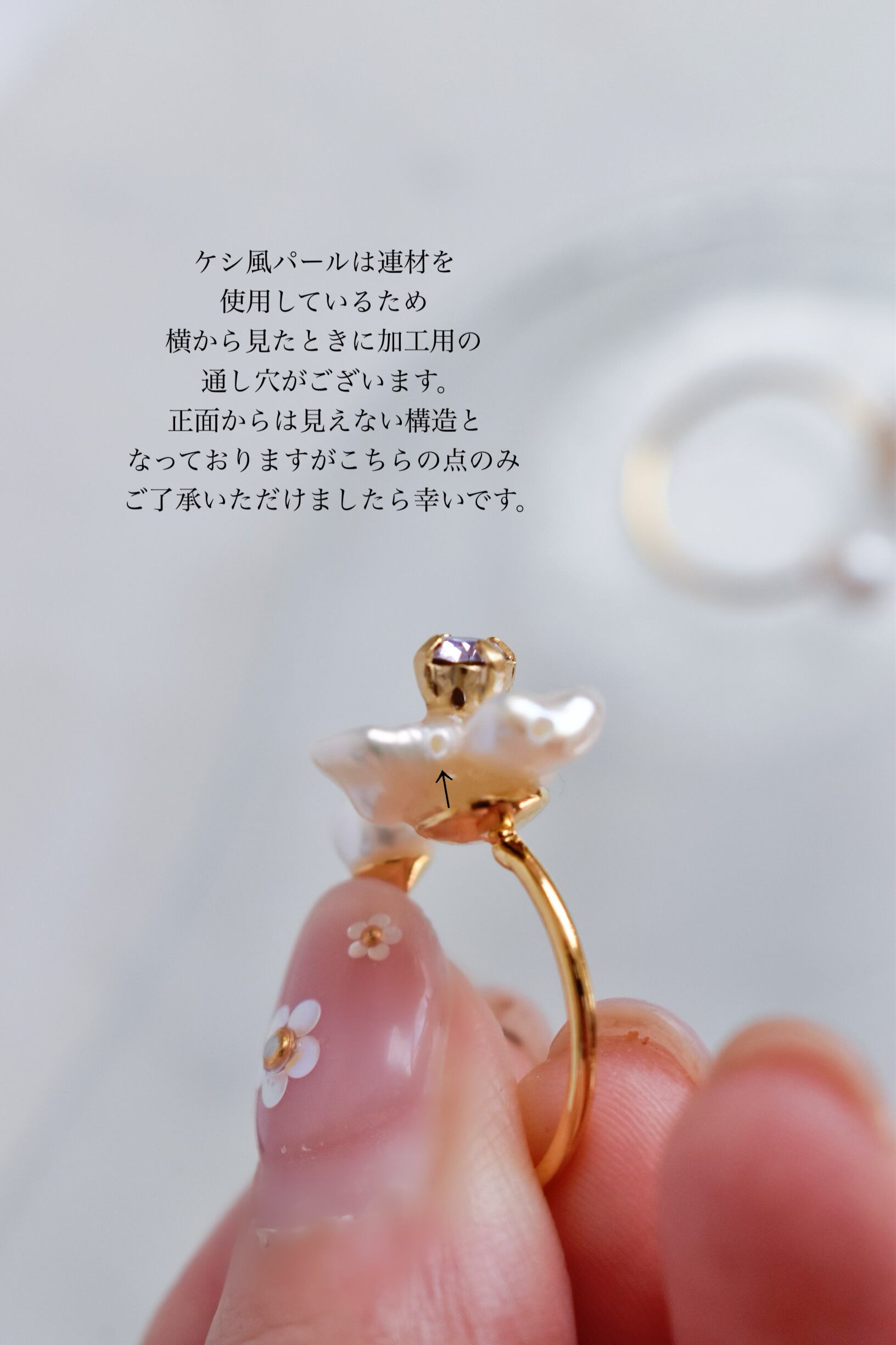 それらを用いてお花の形を手作業にて形成している為、人工パーツで作り上げるものに比べ個体差が